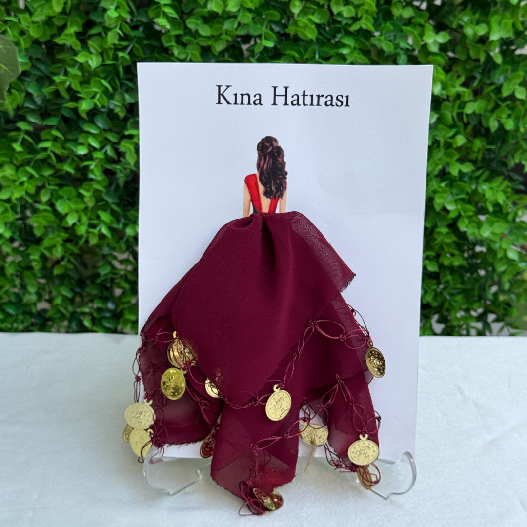 Die elegante Brautillustration auf der Karte und der Text „Henna Souvenir“ verbinden sich mit der reichen Textur des Chiffonstoffs zu einer auffälligen Harmonie.