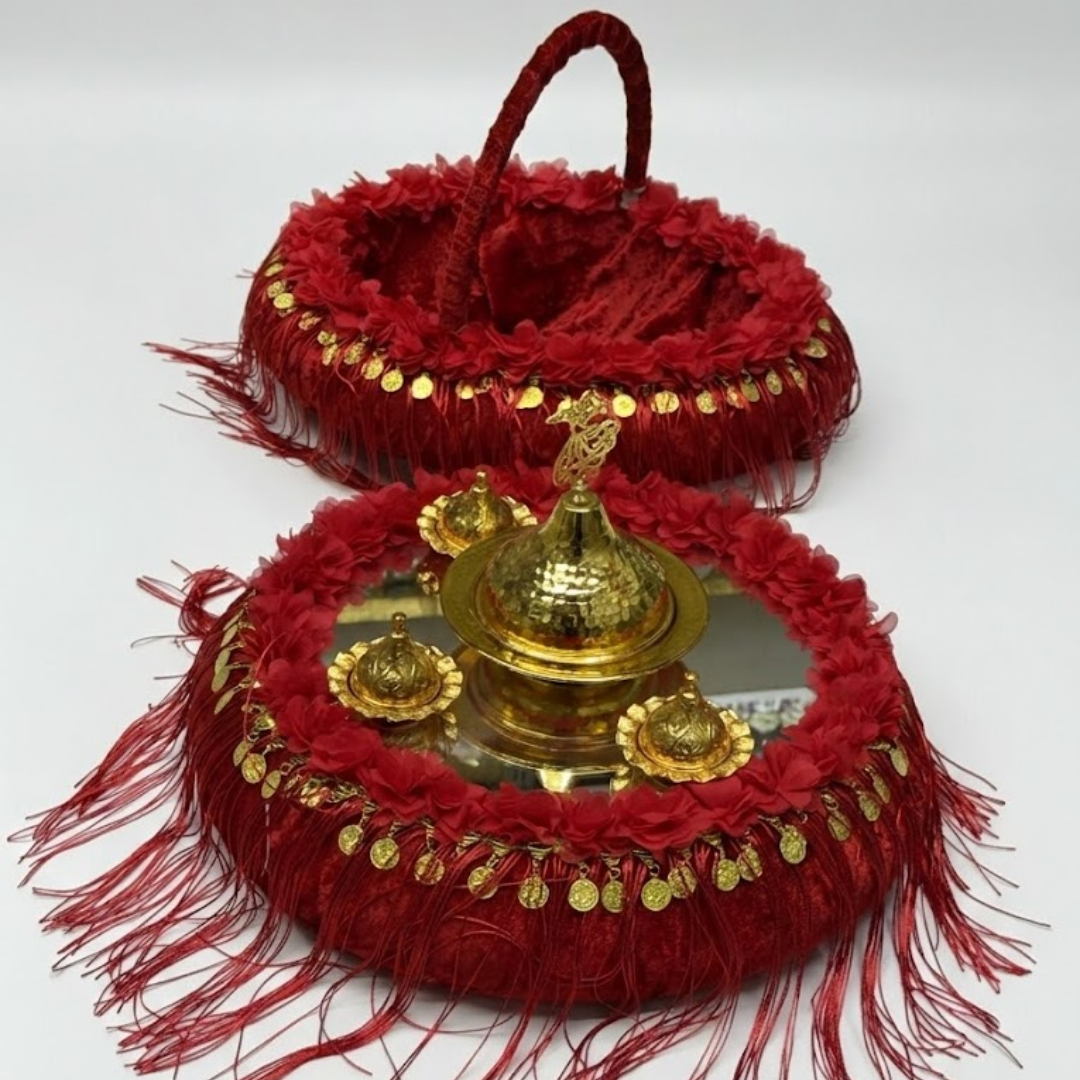 Ein auffälliges Set, das für die Henna-Beleuchtungszeremonie entworfen wurde, den schönsten Moment der Henna-Nacht. Die langen Quastenfransen, die das Tablett und den Korb umgeben, sind ein optischer Leckerbissen und sorgen für eine wunderbare Bewegung während des Henna-Abgangs und des Tanzes.