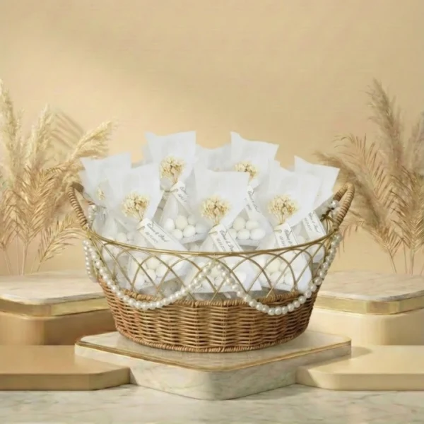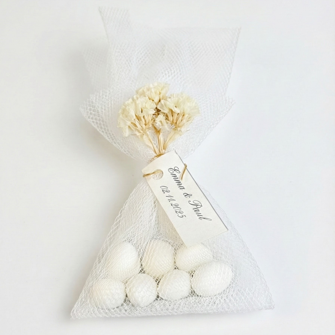 Ein stilvolles Design, das die traditionelle Präsentation von Hochzeitsbonbons aus Tüll mit persönlichen Details in die heutige Zeit bringt. Natürliche Cypso-Blüten und ein speziell angefertigtes Etikett (mit Ihrem Namen/Datum) auf dem eleganten Tüllbündel verwandeln das Produkt von einer gewöhnlichen Süßigkeit in eine besondere Erinnerung für Sie.