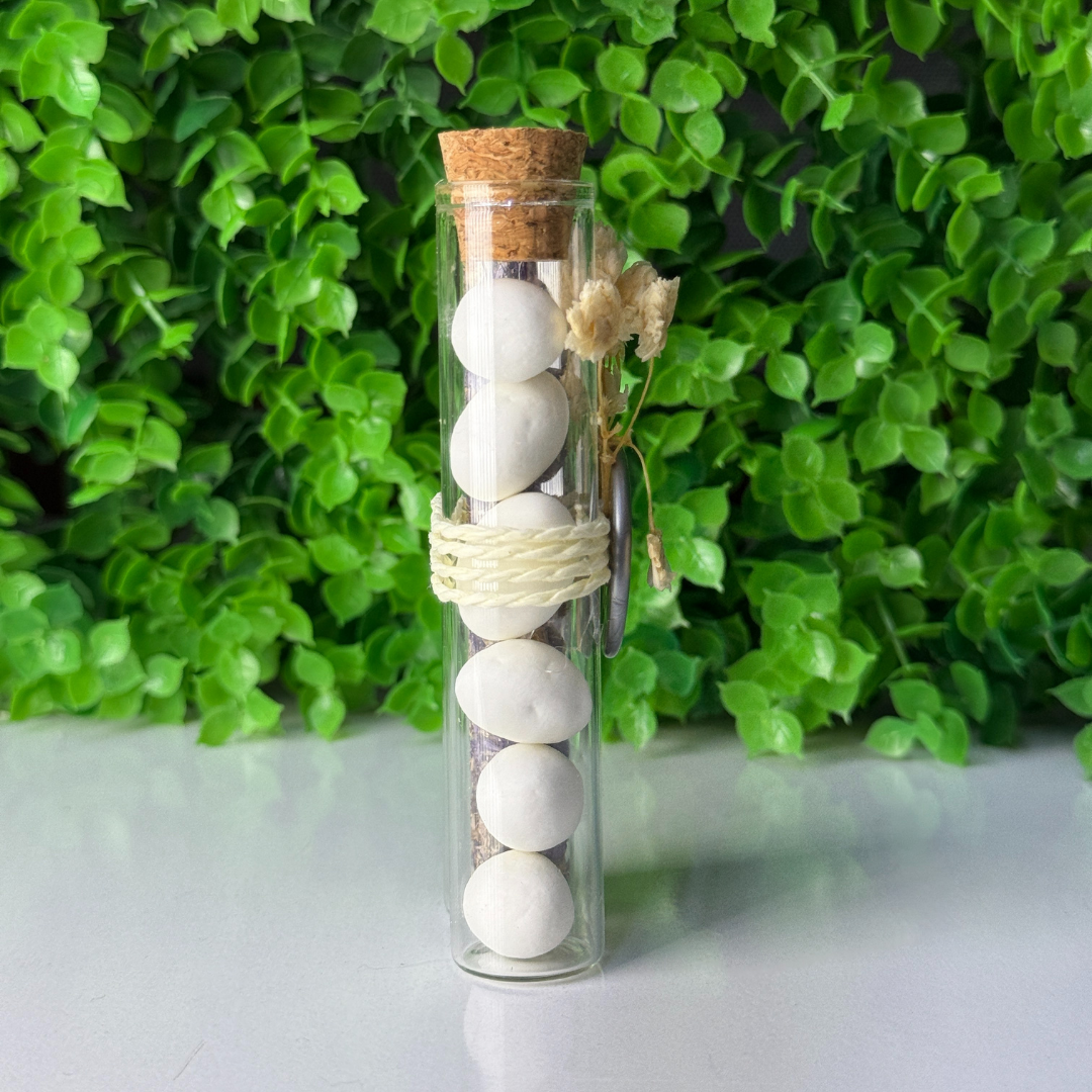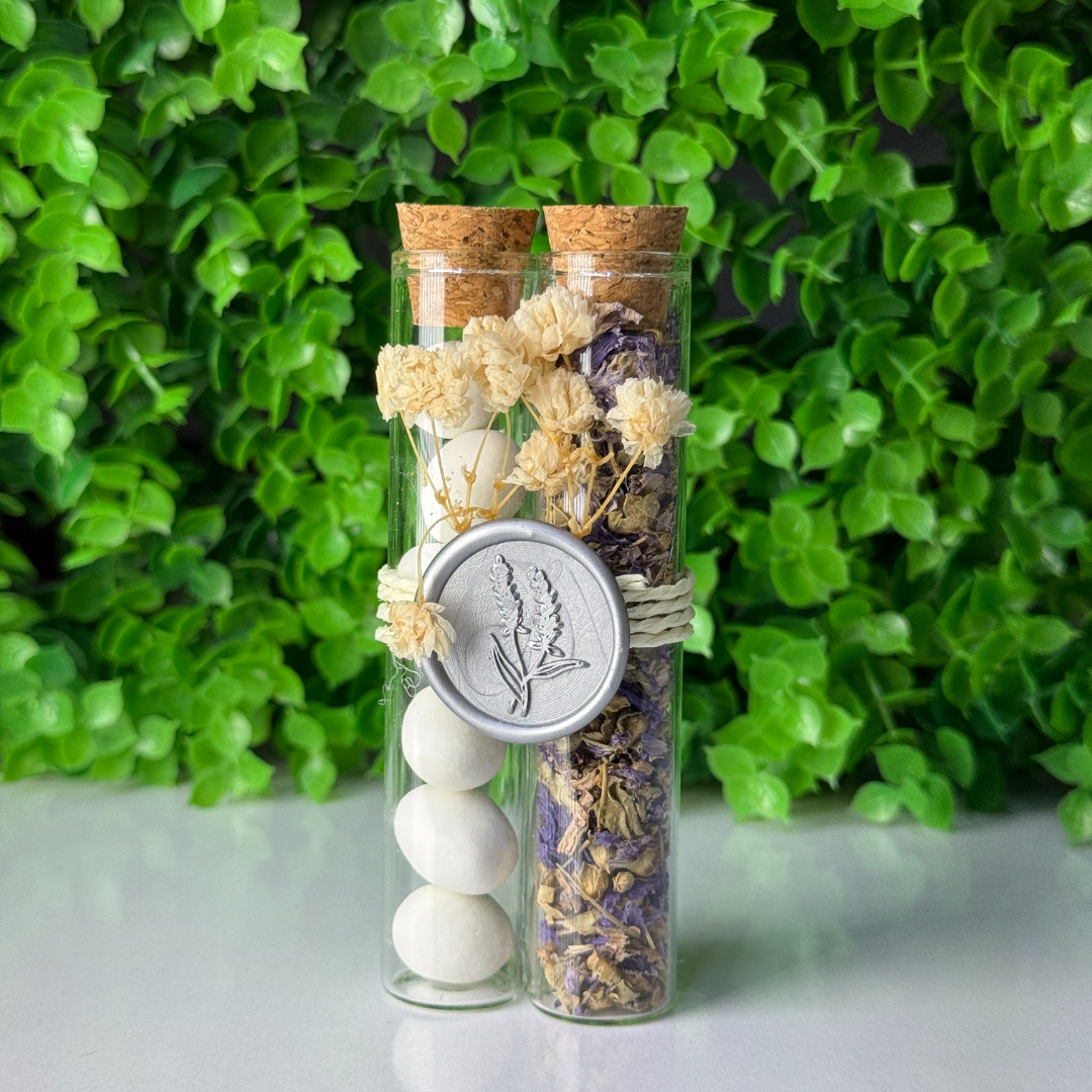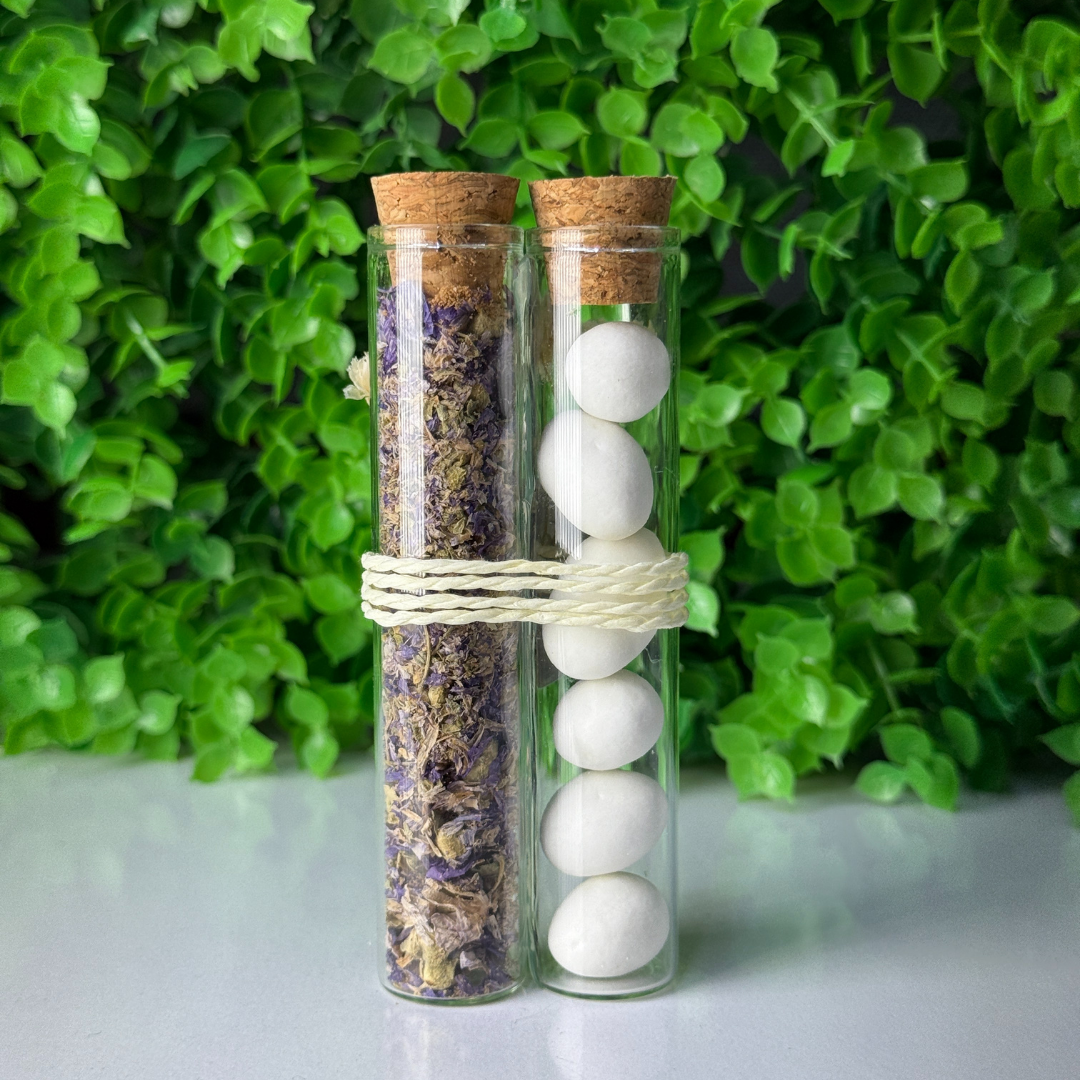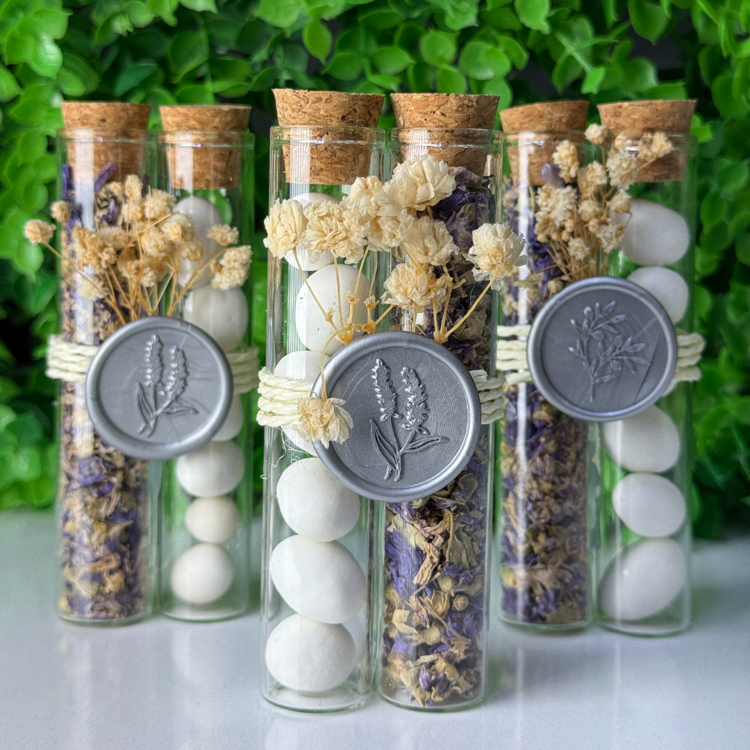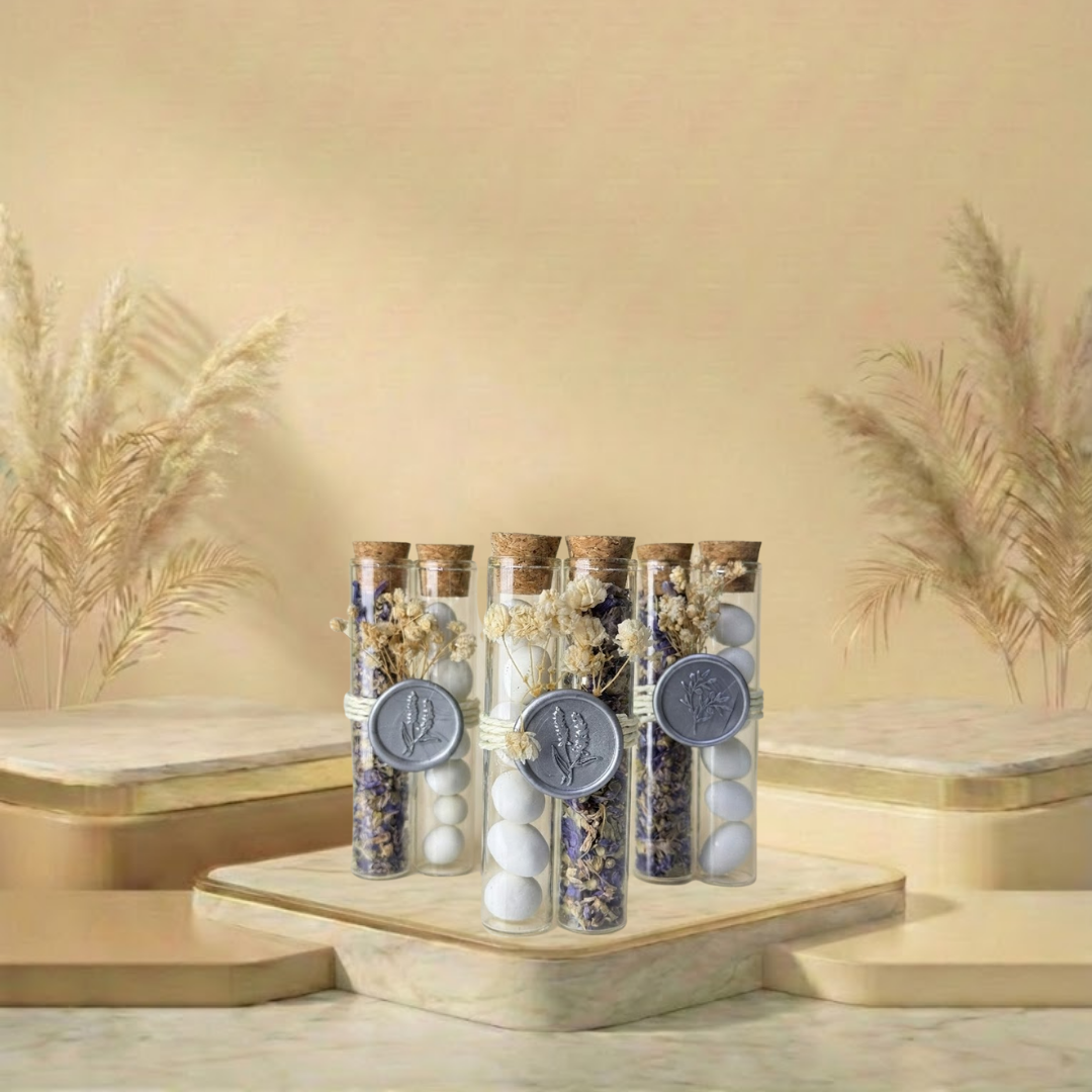 Ein speziell gestaltetes Geschenk in Form einer doppelten Tube, die sowohl optisch als auch inhaltlich einen Unterschied macht. Eine der Tuben ist mit getrocknetem Lavendel und die andere mit köstlichen Hochzeitsbonbons gefüllt, was den Gaumen anspricht.
