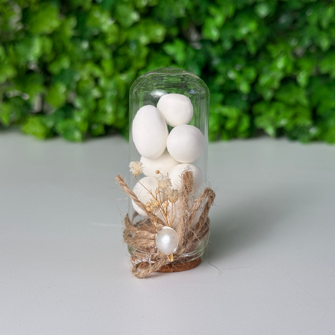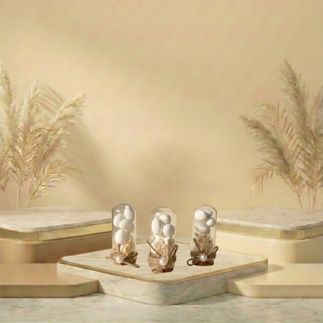 Ein besonderes Geschenk in Form einer umgedrehten Röhre, die auf einem Korken aufrecht steht und den klassischen Hochzeitsbonbons eine kreative Note verleiht. Die Natürlichkeit des Weidenseils und die romantische Atmosphäre der Cypso-Blume verbinden sich mit dem Perlendetail in der Mitte zu einem eleganten Ganzen.