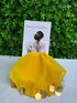 Gelb-goldenes Halstuch aus hochwertigem Chiffon, verziert mit goldfarbenen Münz- oder Scheibenapplikationen am Saum, stilvoll präsentiert auf einer dekorativen Karte mit Brautmotiv und Begrüßungsschriftzug