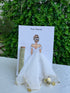 Bestehend aus einem Glasröhrchen mit Henna, einem weißen Tuch mit goldfarbenen Münzanhängern und einer dekorativen Karte mit Brautmotiv
