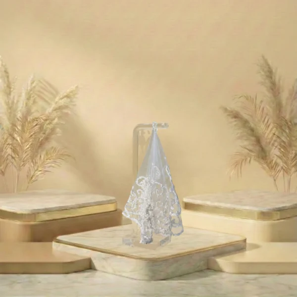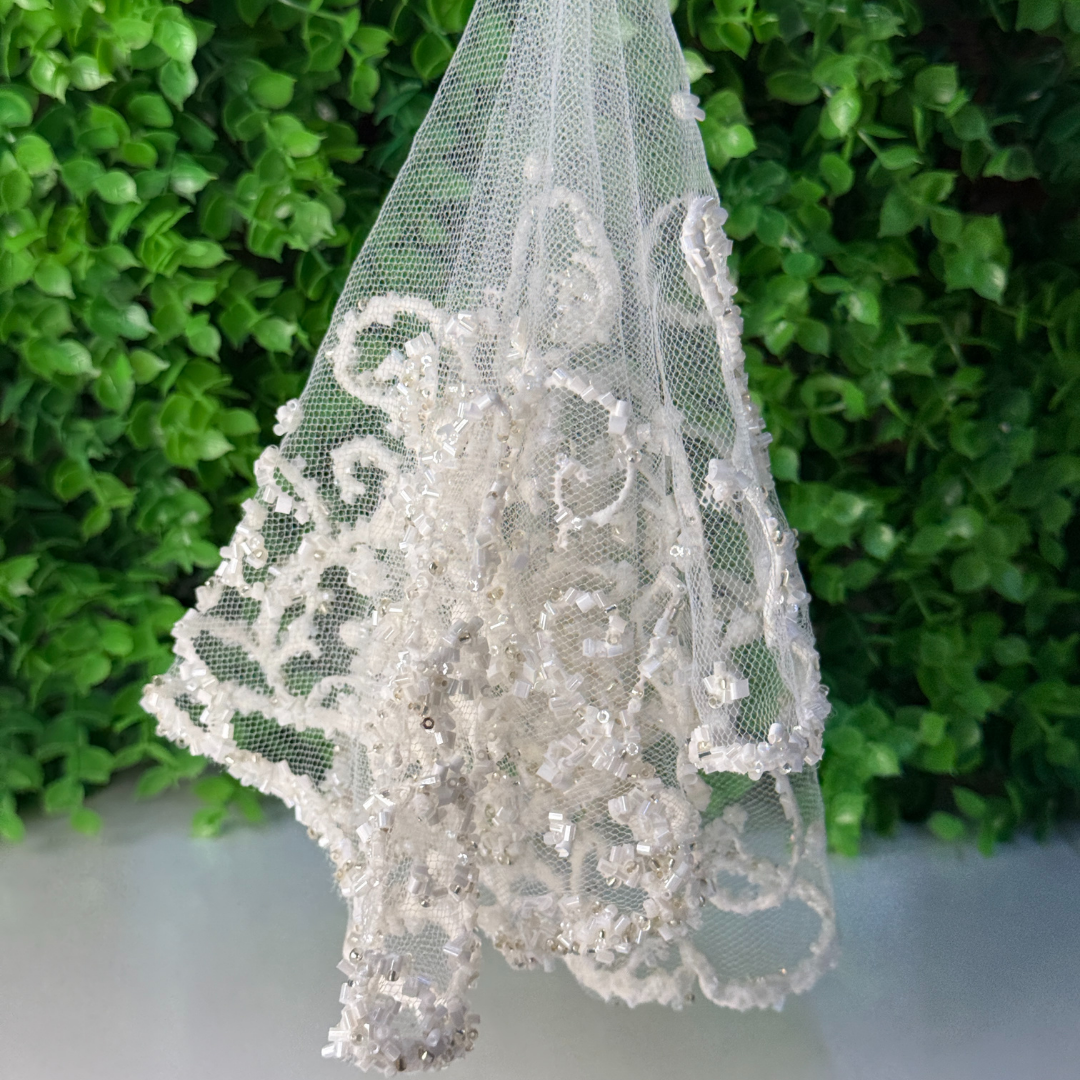 Tül üzerine işlenmiş kabartmalı dantel ve boncuk motifleri.