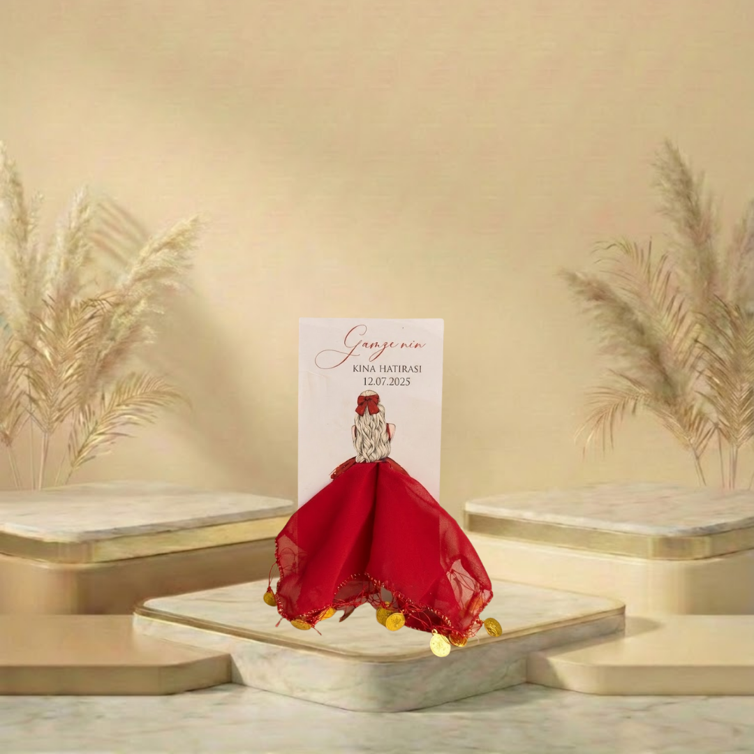 Gelin figürünün eteği olarak tasarlanan kırmızı şifon mendil ve uçlarındaki gold pullar, hem görsel bir bütünlük sağlar hem de halaylarda eğlencenize eşlik eder. Misafirlerinize sadece bir mendil değil, üzerinde adınızın yazdığı, o geceye ait unutulmaz bir anı bırakmak isteyenler için mükemmel bir seçimdir.