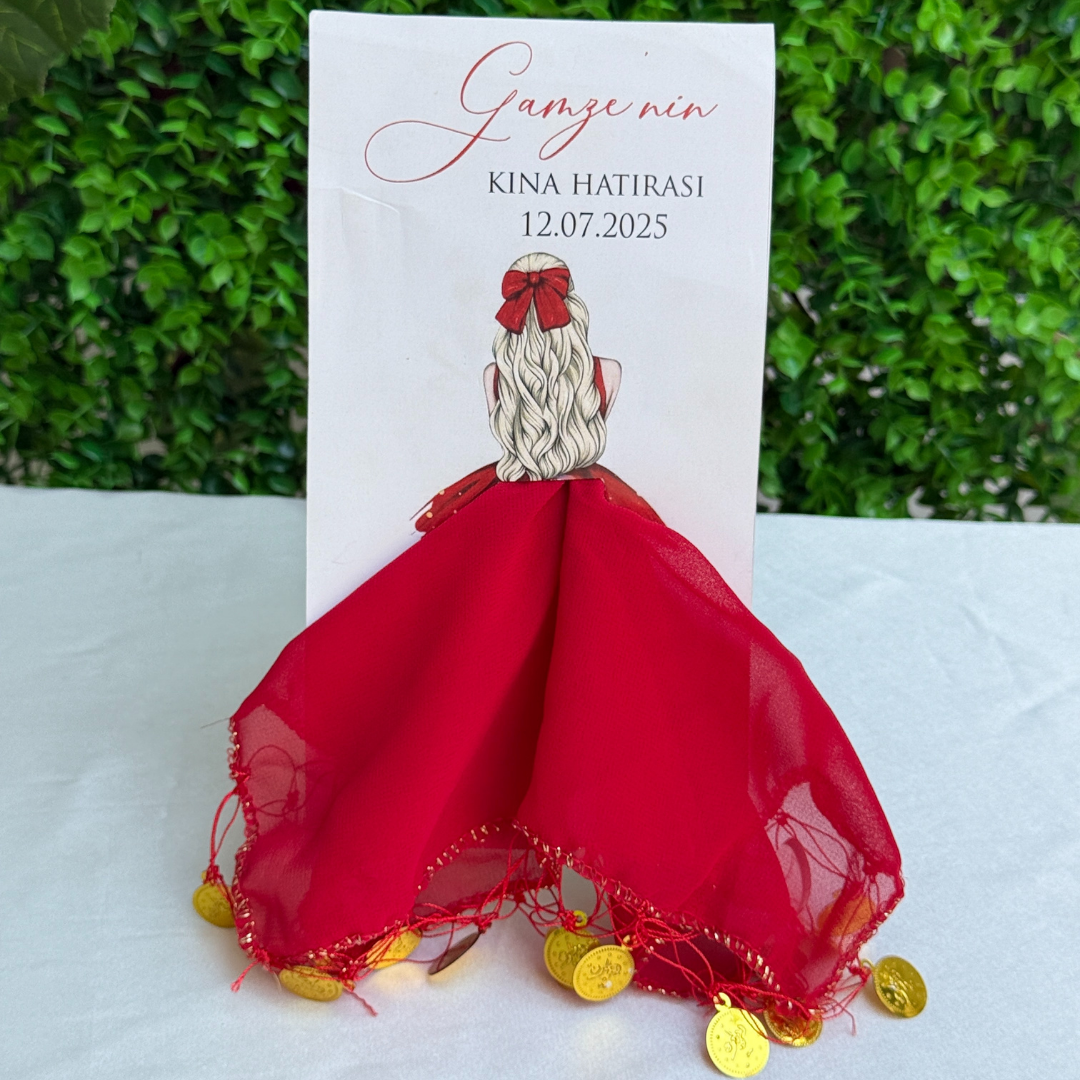 Kına gecenizi tamamen size ait kılan, isminiz ve tarihinizle kişiselleştirilmiş çok özel bir hatıra. Kart üzerindeki size özel yazılar ve saçında kırmızı fiyonk taşıyan zarif gelin illüstrasyonu, bu tasarımı diğerlerinden ayırır.