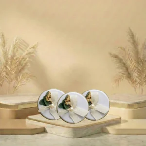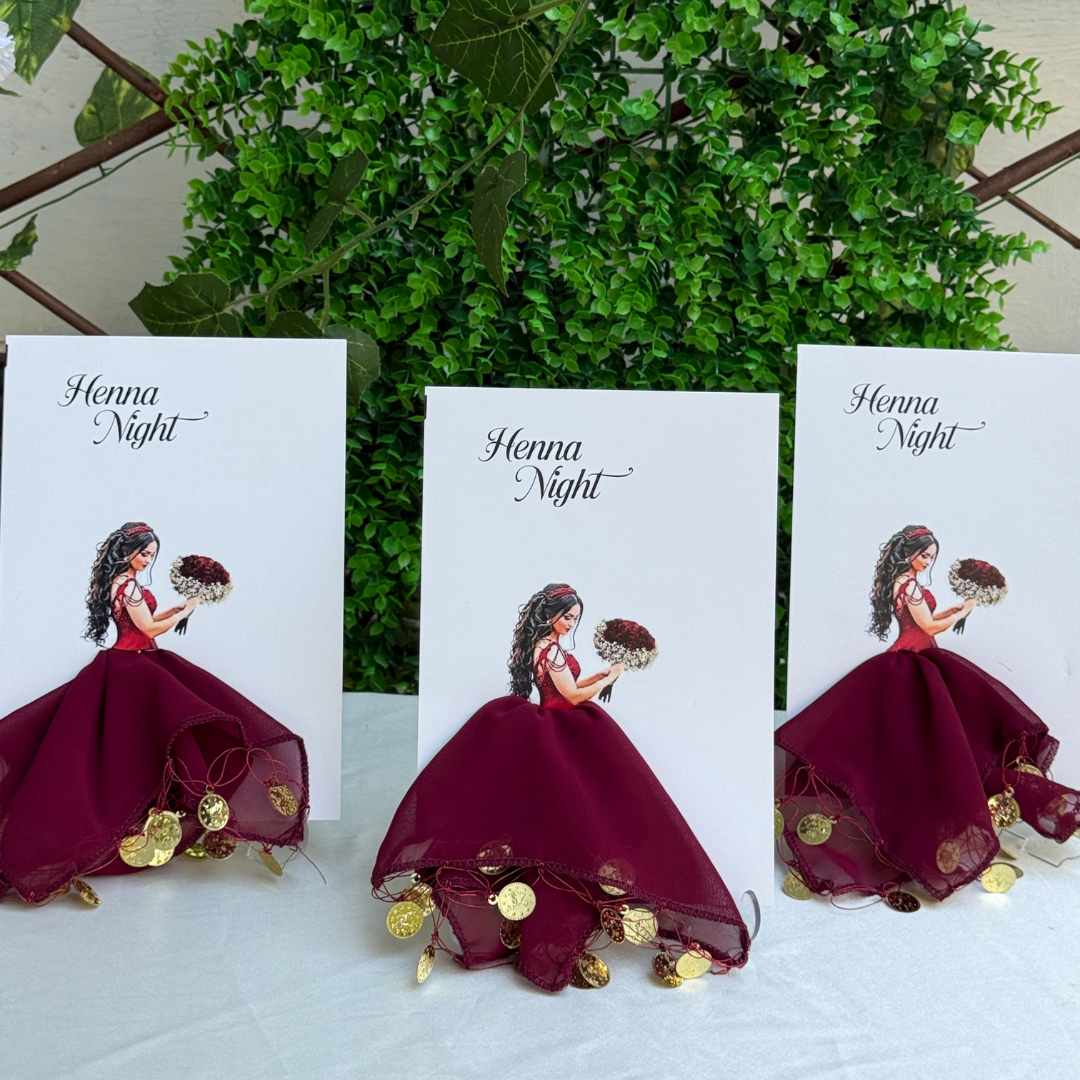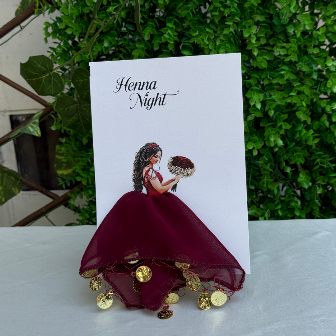 Figürün eteği olarak tasarlanan şifon mendil , uçlarındaki gold pullarla mükemmel bir kontrast oluşturur. Modern kına geceleri ve şık konseptler için fark yaratan, zarif bir hatıradır.