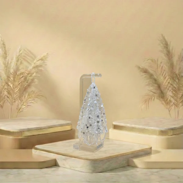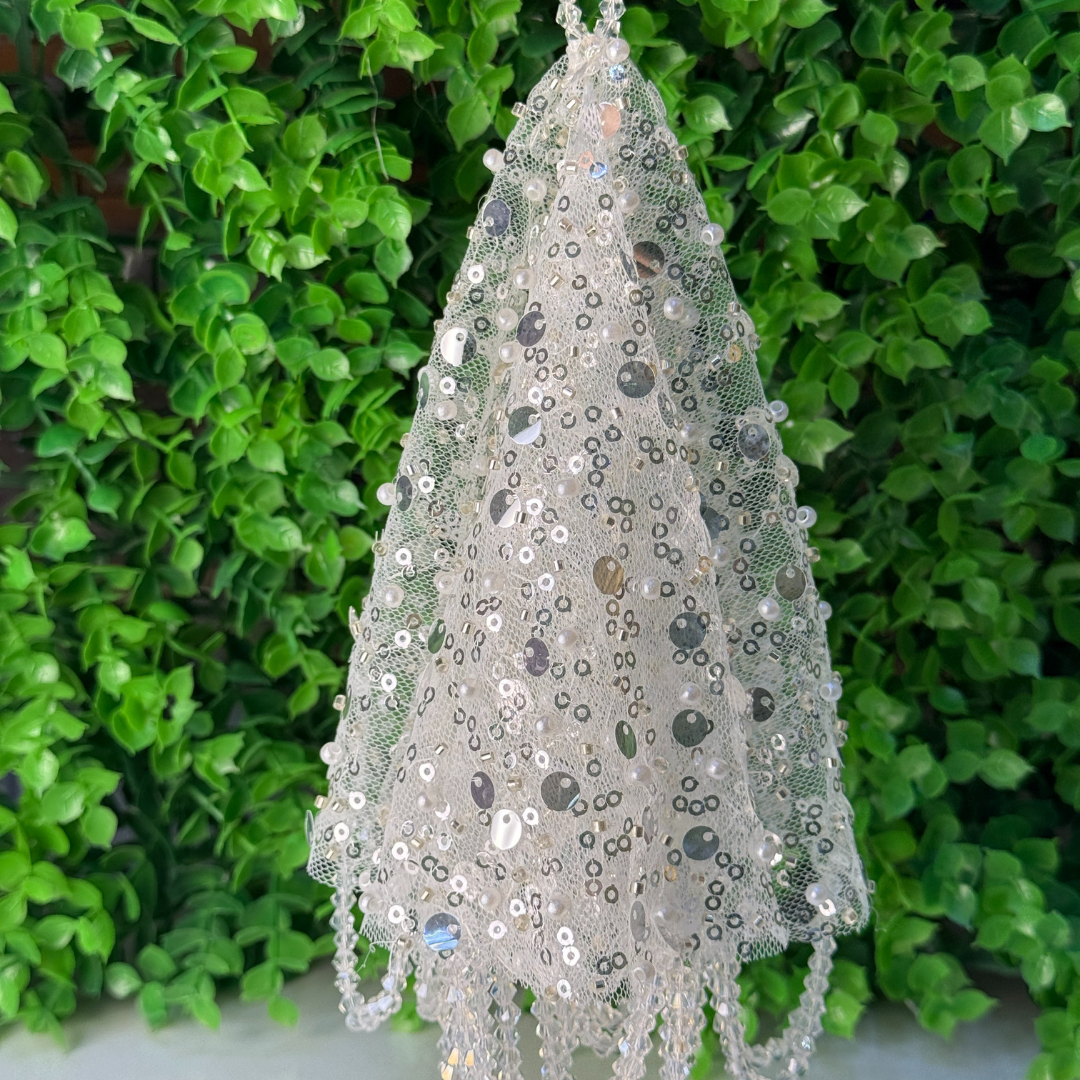 Kırmızı modelin zarafetini, beyazın masumiyeti ve gümüşün modern ışıltısıyla buluşturan premium tasarım. Mendilin tüm yüzeyi ışığı yansıtan gümüş payetlerle kaplanmış olup, uçlarındaki kristal boncuk püsküllerle hareketlendirilmiştir.