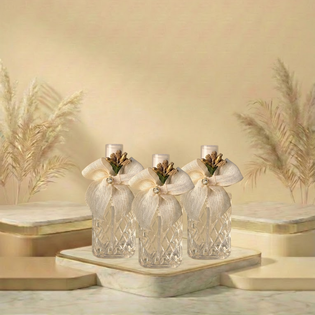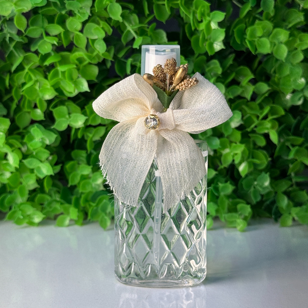 Doğallığı ve zarafeti buluşturan özel tasarım hediyelik kolonya şişesi. Şişeyi saran keten kurdele fiyonk, ortasındaki gold taş detayıyla parıltılı bir görünüm kazanırken; yanındaki minik pıtırcık çiçekler tasarıma romantik bir hava katar.